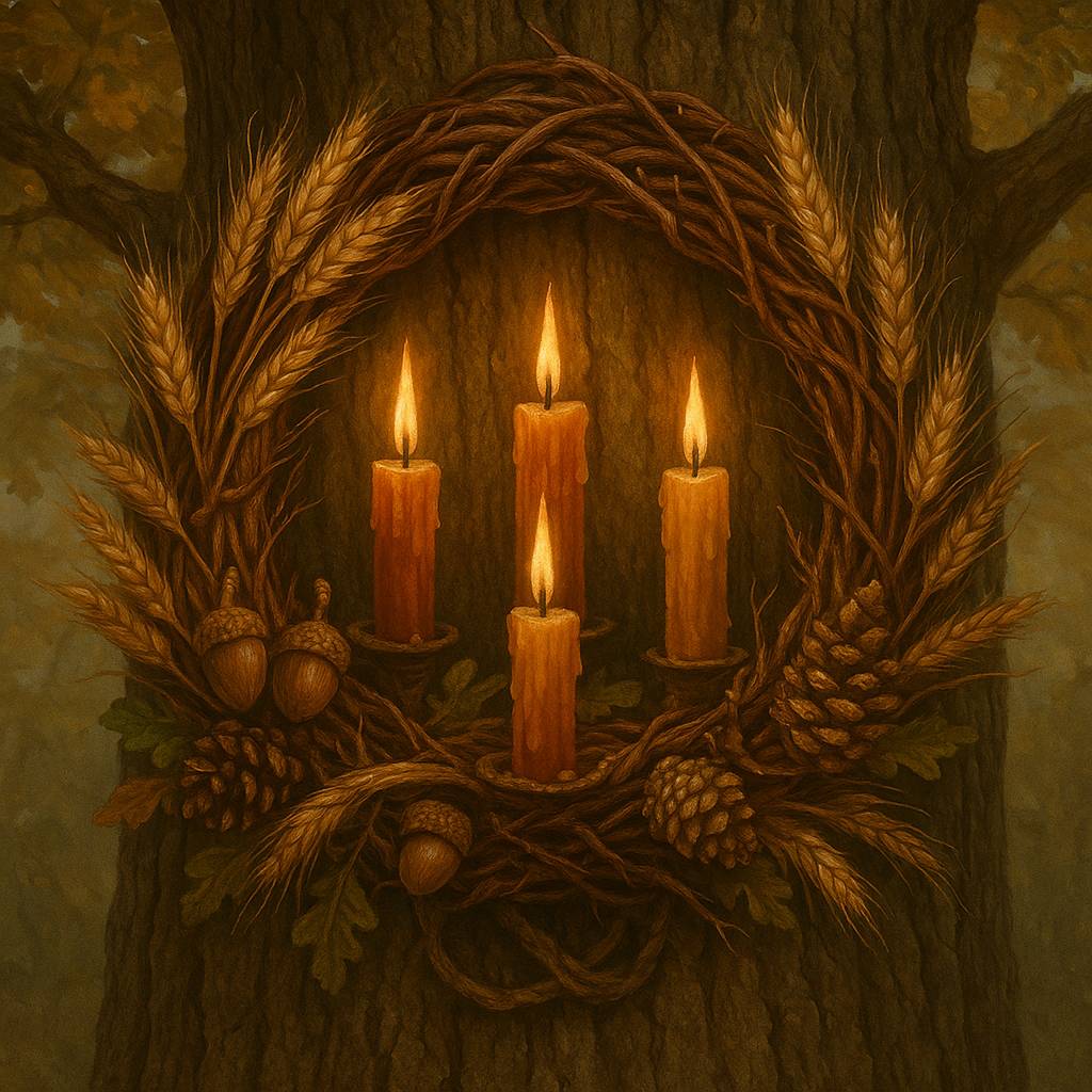 Elen walked the path toward the village square, her basket bumping against her hip. Inside it lay her offering: a loaf braided from wheat she and her family had harvested the week before. The bread was brushed with honey and scattered with roasted acorns for luck. She had tucked in two sprigs of ivy for protection and wound a ribbon of dark red cloth around the handle.